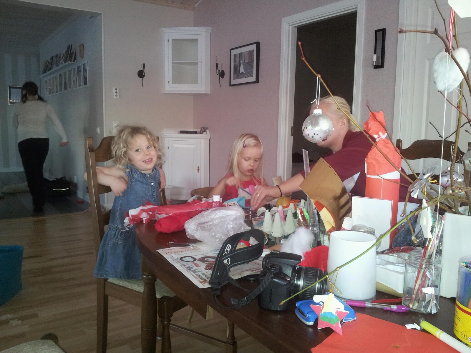 Idag har vi julpysslat med småkompisarna (som inte är så små längre, de blir ju snart 4!). Supermysigt! Det blev tomtar, julgranskulor, smällkarameller och pepparkakor så det stod härliga till! E var jättetrött när vi kom hem men hann in i nån sorts andra andning och blev helt hopplös att få i säng - nu kan jag äntligen pusta ut, två timmar efter att hon gick o la sig!